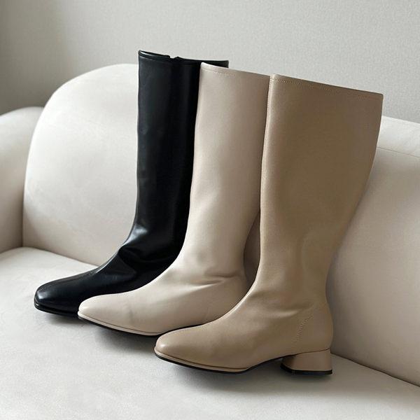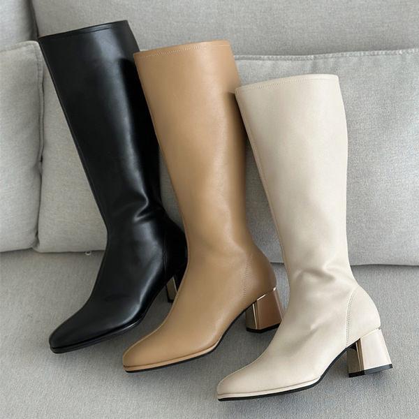 ロングブーツ ジョッキーブーツ 天然牛革 スクエアトゥ サイドジップ レディース チャンキーヒール 黒 白 ブラック ベージュ ホワイト 靴 婦人靴 韓国