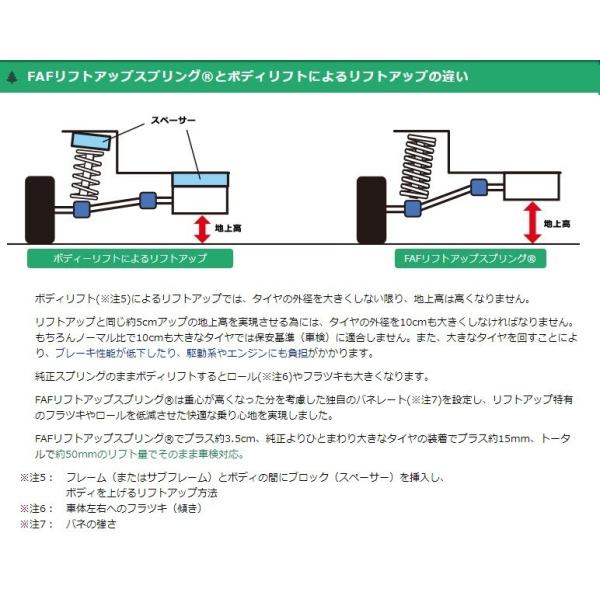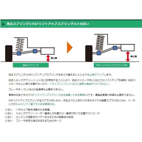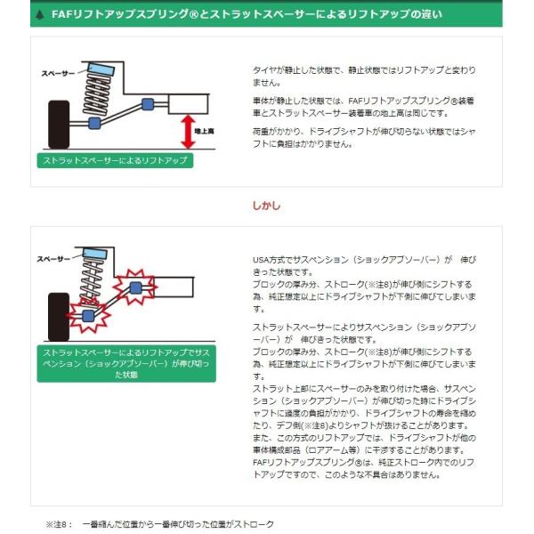 通常、リフトアップ(地上高)すると重心が高くなります。純正スプリングと同じバネレート(強さ)でリフトアップするとフラツキが多くなり、操縦性が不安定になります。フラツキを解消しようとバネレートを高く(強く)すると乗り心地が悪くなります。FAFリフトアップスプリングは、独自のノウハウ・バネ設定により、リフトアップと乗り心地の相反するものを両立!!