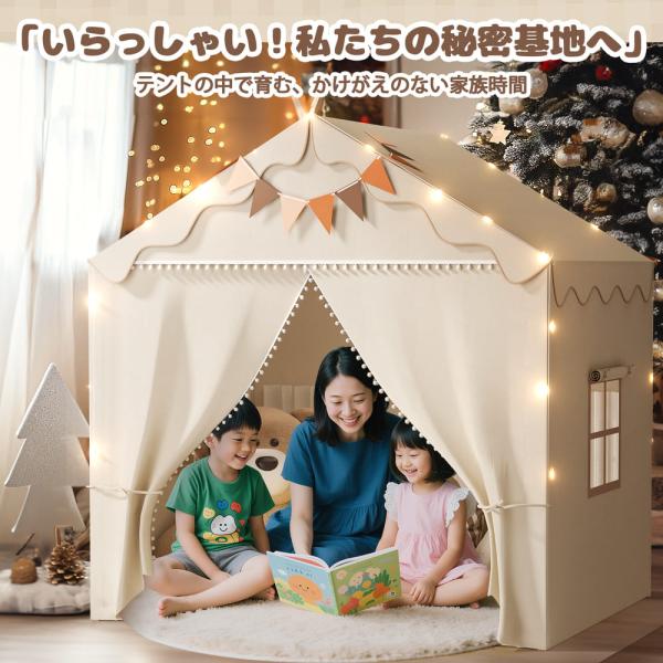【広々空間:親子・仲間共に楽しむ】約 135cm×130cm×100cm のサイズで、2〜3 人の子供と大量のおもちゃを余裕で収められる。親が一緒に入って読み聞かせしたり、兄弟姉妹が並んでくつろいだり… 遊びもくつろぎもできる「共有スペース」で、家族や友達との距離を近づける。
