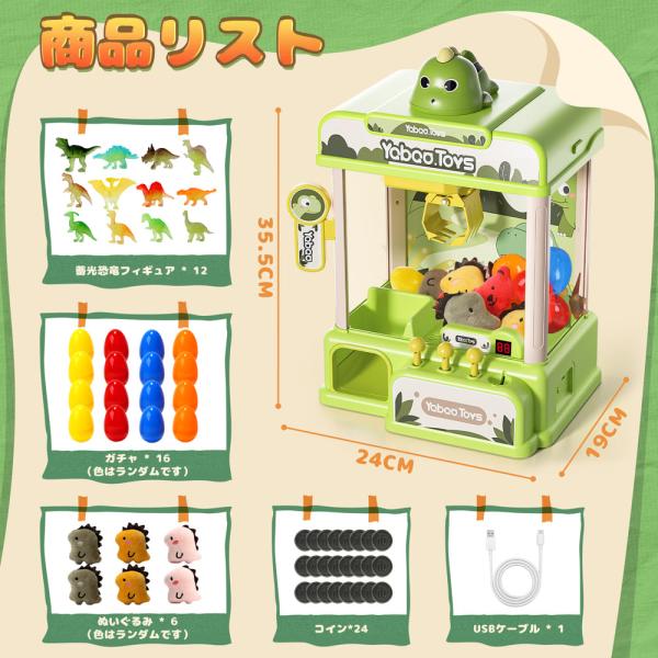 【セット内容】本体×1、USB充電ケーブル×1、コイン×24、恐竜ぬいぐるみ×6(色はランダムです)、ガチャ×16(色はランダムです)、蓄光恐竜フィギュア * 12が含まれています。