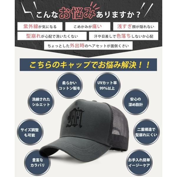 キャップ本体には通気性に優れたメッシュ素材を使用し、後頭部のムレを軽減。前面は厳選された高品質コットンで、柔らかく軽量、長時間かぶってもストレスなし。2重構造で型崩れしにくく、型をキープしながらも洗濯もOK!日常のちょっとしたお出かけや、アウトドア、ランニング、釣り、ゴルフ、キャンプなど、あらゆるシーンで活躍する万能デザインです。