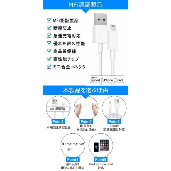 iPhone充電 ケーブル USB ケーブル iPhone ケーブル 0.25m/0.5m/1m/2m 高品質 AppleMFI認証品 急速充電 2.4A 断線強い 高品質 USB iPad対応