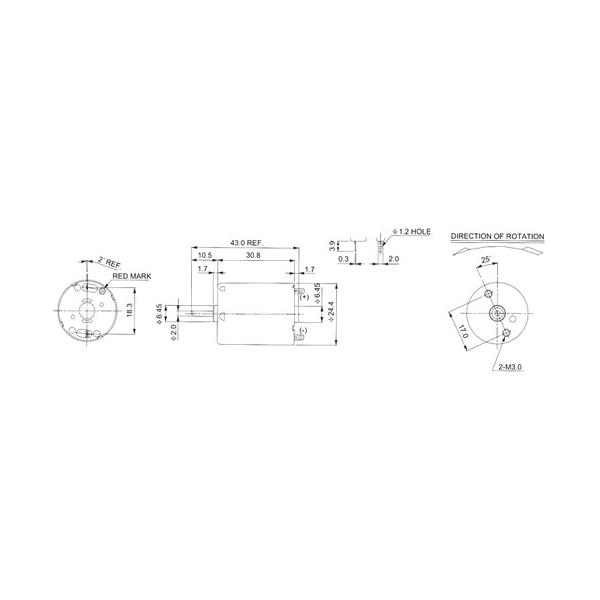 <電圧>定格電圧: 12VDC動作電圧:9.0〜15.0VDC<無負荷>回転速度:3037rpm無負荷電流: 11mA<最大効率>回転速度:2533rpmフルロード電流:55mAトルク: 20.9gcm<ストールトルク>:126.2gcm寸法:直径約24.4mm×本体長約30.8mm