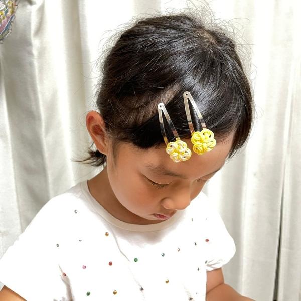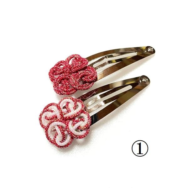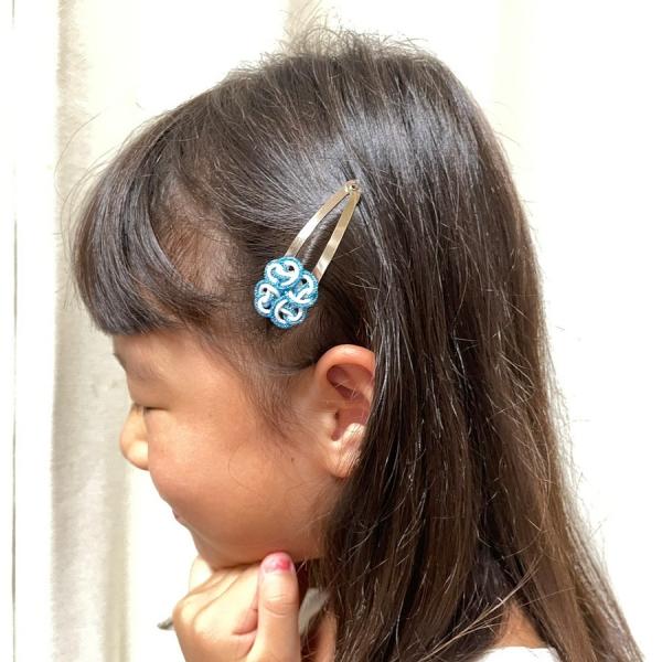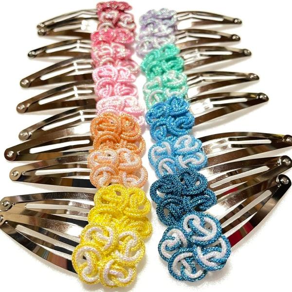 四つ葉の組紐の大きさ 約2cmくみひもはオーロラと呼ばれるキラキラした糸を使い組み上げられた紐はとても可愛いく、全部で10パターンあり好みの色がきっと見つかります。伝統の組紐を新しい形に仕上げた商品です。こちらは2個で1つの購入になります。