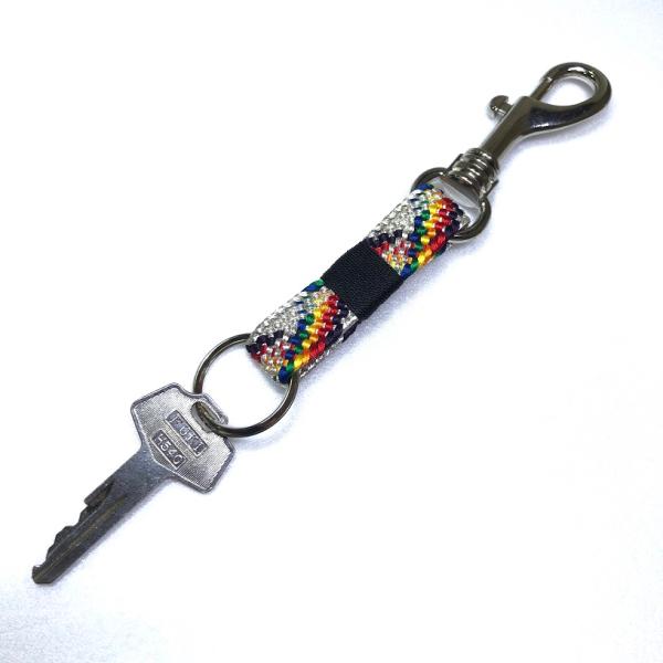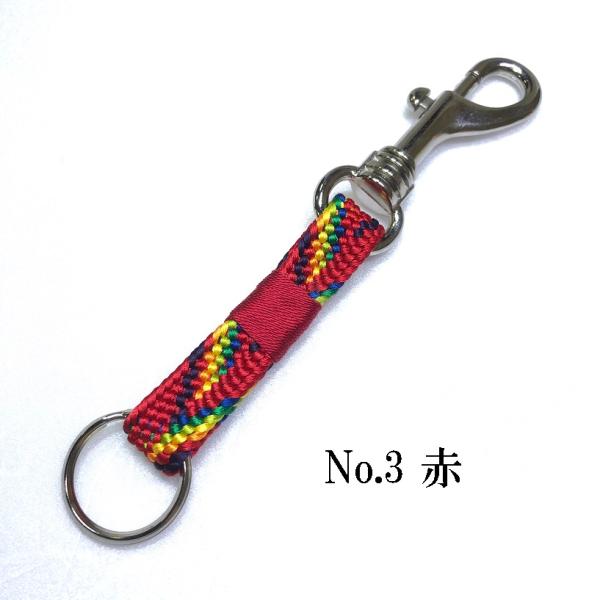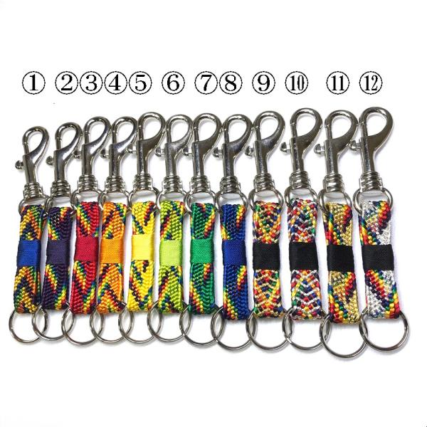 帯〆で製作されたキーホルダー。片側に鍵を付けていただき片側には鞄、ベルトのホック、壁のホックなどに引っ掛ける事が出来、使い勝手が良いです。色合いも厄除・お守りの色を使用している為、縁起の良い商品です。