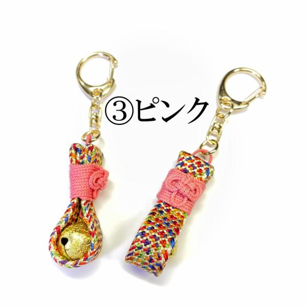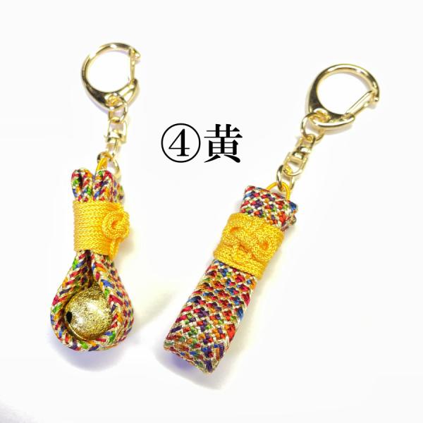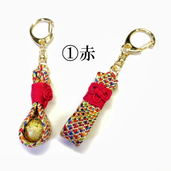 お守(厄除)キーホルダー 守り袋(金) 組紐 手作り ハンドメイド 国産 伊賀 三重 正絹 帯締 帯〆 細紐 紐 金 カラフル 7色 7color 鈴 音