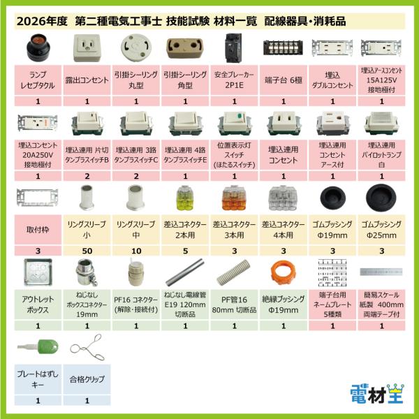 電材王 2026 年度 第二種電気工事士技能試験向けの練習用材料セットAです。