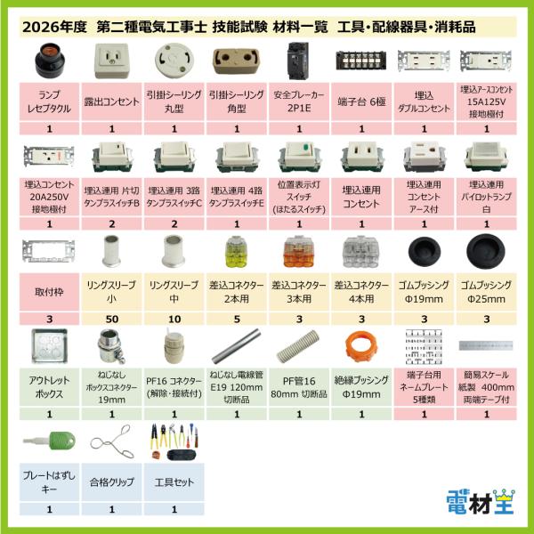 第二種電気工事士 技能試験セット E 2026 全13問対応 電線2回分 配線器具セット 合格クリップ プレート外しキー付 電気工事士 2種 電材王