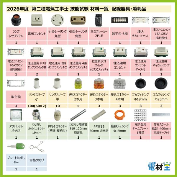 第二種電気工事士 技能試験セット E 2026 全13問対応 電線2回分 配線器具セット 合格クリップ プレート外しキー付 電気工事士 2種 電材王