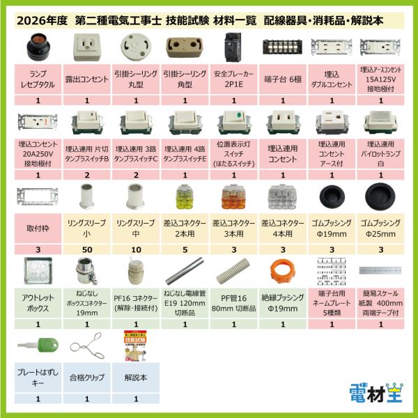第二種電気工事士 技能試験セット E 2026 全13問対応 電線2回分 配線器具セット 合格クリップ プレート外しキー付 電気工事士 2種 電材王