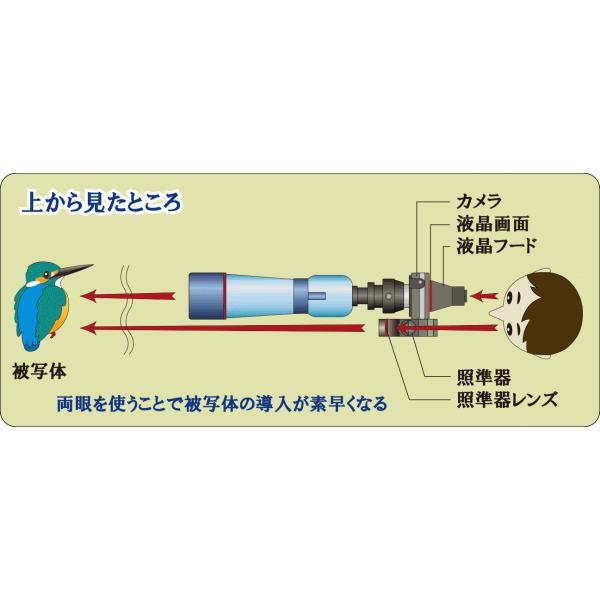 小型&軽量な照準器本体を両眼視システムとしてセットしました。多くのカメラで両眼視しやすく、ほとんど顔を動かすことなく撮影ができます。