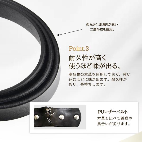 <高品質素材>上質な牛革を使用し、高級感あふれる仕上がりを実現。耐久性に優れ、長く愛用いただける本革ベルトです。