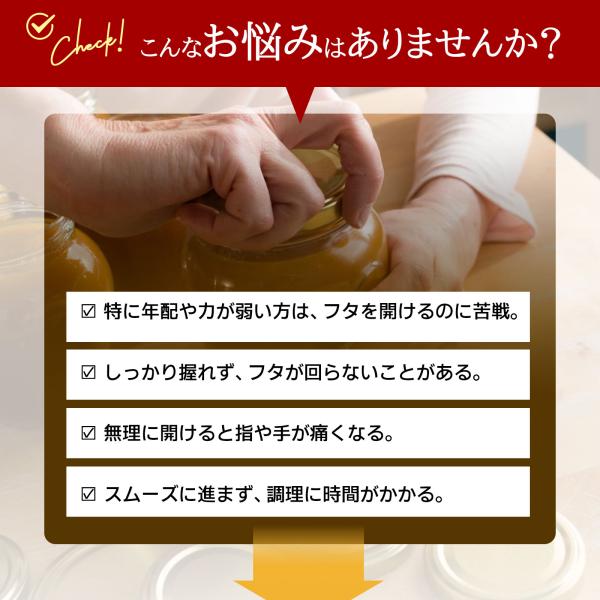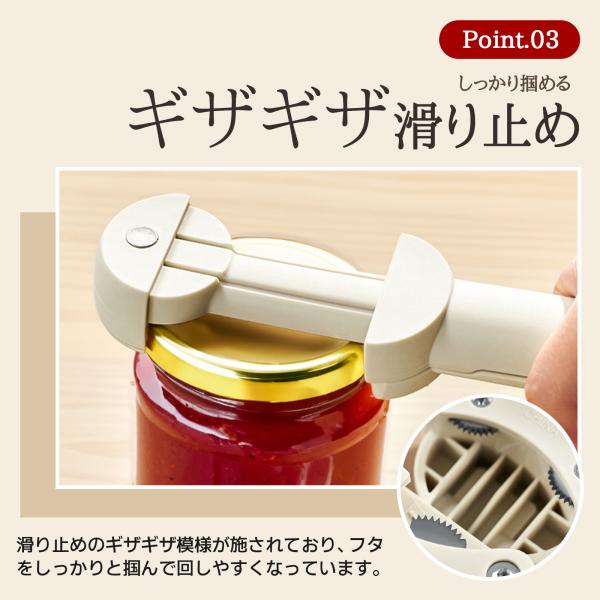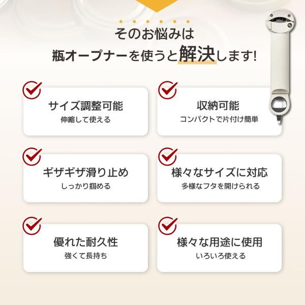 【伸縮自在の調整可能な開栓器】伸縮可能な歯車で、直径2.5cmから9.5cmまでの様々なサイズの瓶蓋に対応。日常生活で使用する瓶の90%以上を開けることができます。科学的なてこの原理を応用し、手の力が弱い女性や高齢者でも、固く締まった蓋を簡単に開けられます。