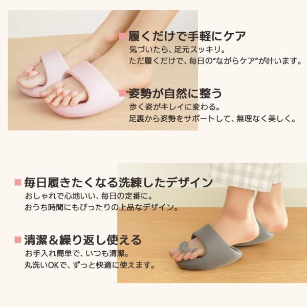 【リラックス効果で心も軽やかに】足指ストレッチ×足裏刺激で、履いた瞬間からリフレッシュ。1日の疲れを癒し、心地よいリラックスタイムへ導きます。