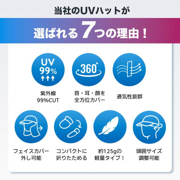 紫外線カット率99%のUVカット帽子で、顔・首・耳までしっかりガード。強い日差しの日も安心して外出でき、アウトドアや旅行、ガーデニングにも最適です。