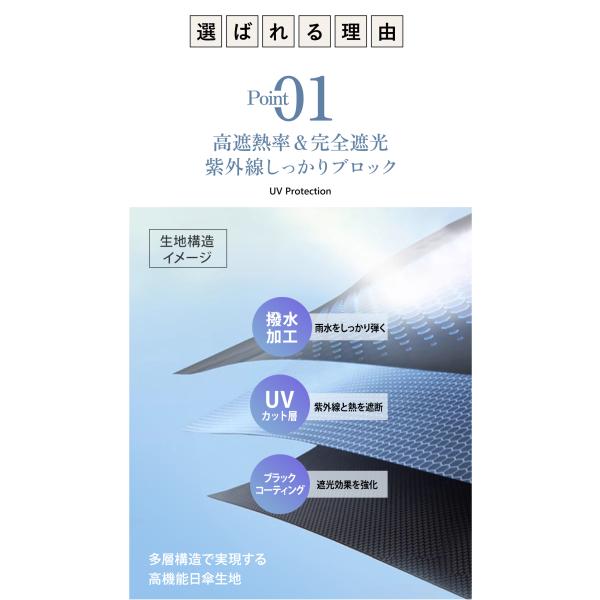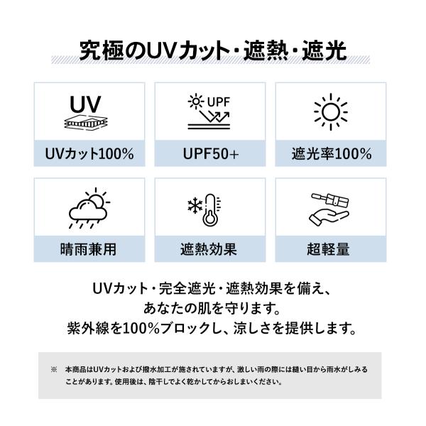 【UVカット*完全遮光】優れた品質、優れた遮光効果、優れた断熱性、高密度傘生地と日焼け止め黒ゴムコーティングを組み合わせています。100%紫外線遮断効果、UPF50+光透過率0、日中も涼しく、肌を効果的に保護します。真夏の強い日差しを遮り、太陽の光や紫外線から大切な肌を守り、紫外線カット率99.9%以上の日焼け対策アイテムとして猛暑を乗り切ることができます。