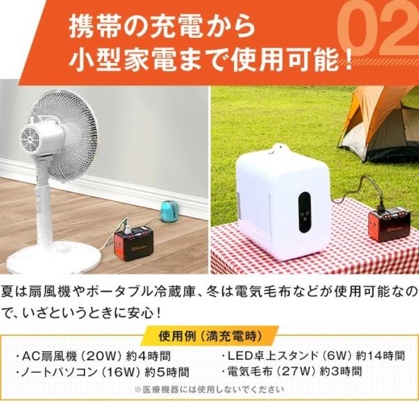 携帯の充電から小型家電の連続使用まで可能!夏は扇風機やポータブル冷蔵庫、冬は電気毛布などが使用可能なので、いざというときに安心!
