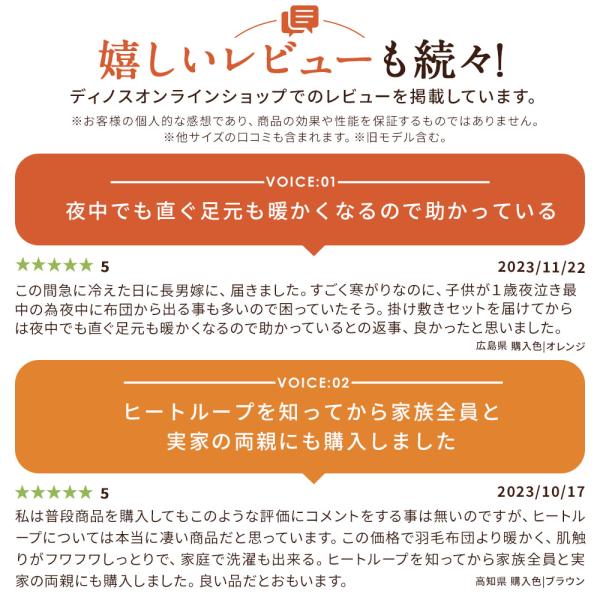 10年以上連続ディノス冬の販売数No.1※1!さらに暖かく夜中に目が覚めると、布団が再び温まるまで寝られないことも…。そんな時におすすめなのが『ヒートループ(R)ハイパー』。アイテムは「毛布」と「敷きパッド」で、湿気を吸うと発熱し、しかもその熱を一晩中キープするすごい寝具です。とにかく、ひたすら暖かいことから10年以上連続ディノス冬の販売数No.1※1!シリーズお客様満足度90%以上※2!側生地にも発熱素材を使い、さらに暖かくなりました!気持ちのいい包まれ感にうっとりします。