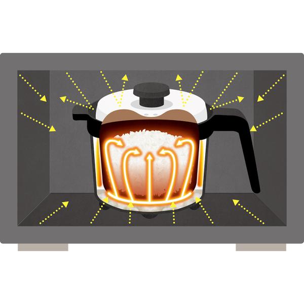 〈焼き目がつく秘密は特許構造!〉電子レンジ調理とは、全方向からのマイクロ波の振動によって食材の水分を高温にすることで加熱します。ところが『レンジメート』は、フタをすることで食材にマイクロ波が当たるのを遮断し、本体内部の発熱体だけにマイクロ波を集中し高温に発熱させます。その温度は約200℃〜300℃。フライパンで焼いているのに近い感覚で調理できるから、しっかりと香ばしい「焼き目」がつくのです。