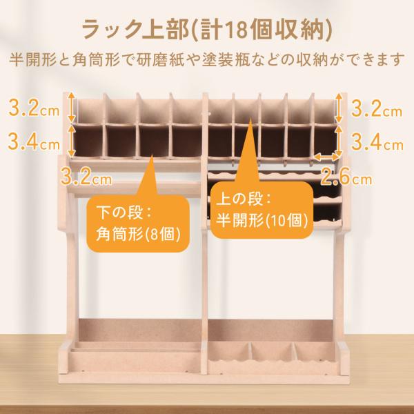 ラック上部(計18個収納)…半開形と角筒形で研磨紙や塗装瓶などの収納ができます。