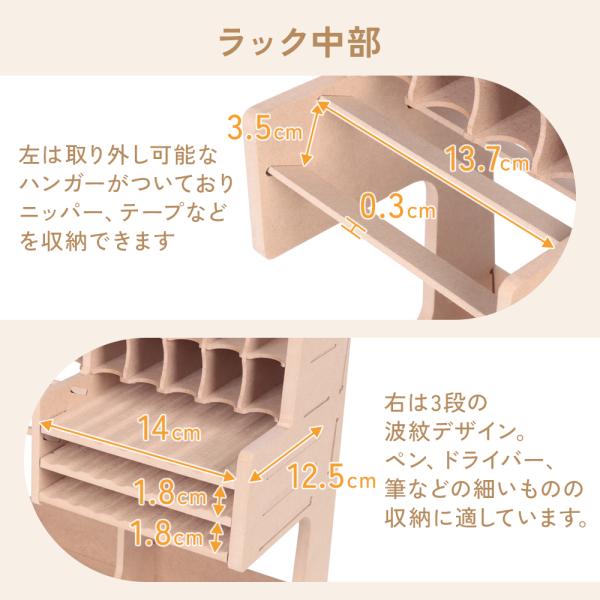 ラック中部…左は取り外し可能なハンガーがついておりニッパー、テープなどを収納できます。