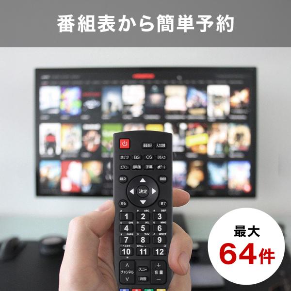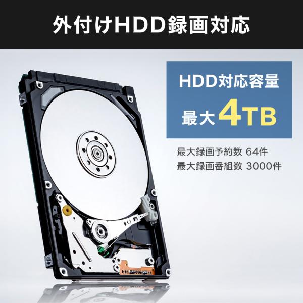HDD録画機能:裏番組録画、番組表から録画予約可能(最大録画件数64件)、最大録画番組数3000、日時指定予約機能、放送時間連動機能