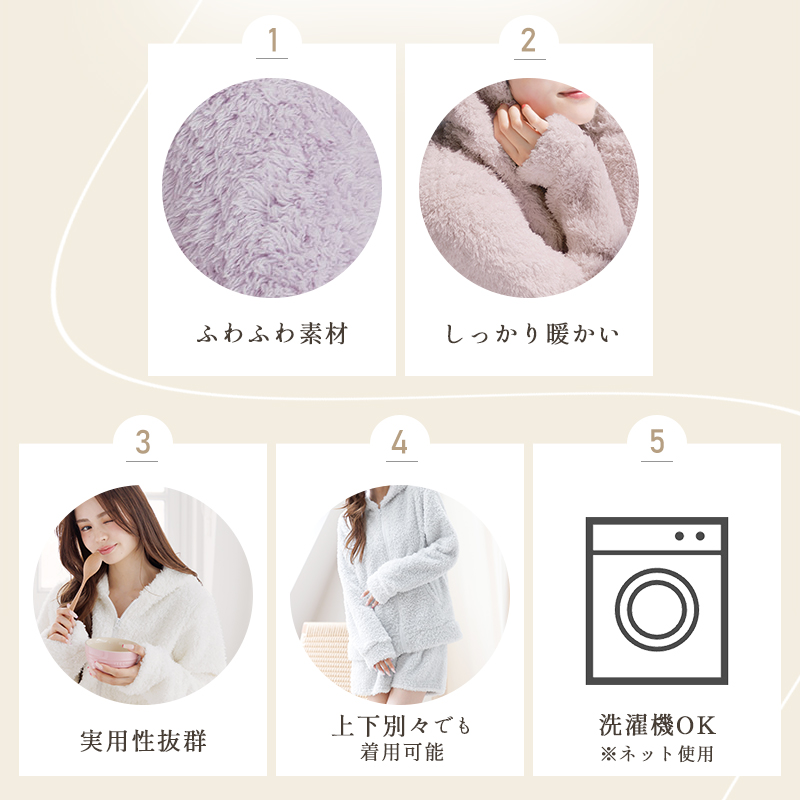 毎年大人気!お泊りやルームパーティでも、愛され度高めのルームウェアに新カラーが登場♪ やわらかいプードルシャギー素材で、抱きしめたくなるフワフワな生地感。着やすいシンプルカラーが揃っています♪ 上下セパレートだから羽織もの感覚で気軽に着用もできます!ポケット付きで機能性も抜群◎ウエストゴムで着脱簡単なショートパンツは、着圧ソックスをご愛用の方におすすめ。お家で洗濯できるので、お手入れも簡単です! ぬいぐるみに抱きしめられたようなもこもこ感を体感してみては?プレゼントとしてもオススメです♪