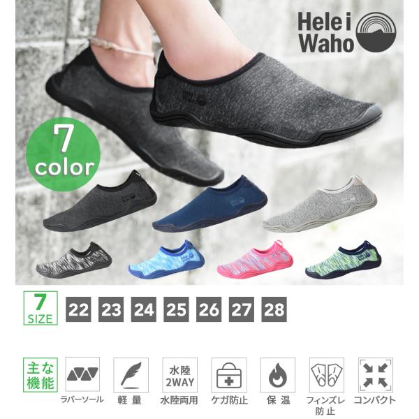 HeleiWaho ウォーターシューズ ( マリンシューズ )の詳細 ブランド: HeleiWaho ヘレイワホ・素材: 4wayストレッチスペーサーファブリック×天然ラバーソール・サイズ: 22 ・ 23 ・24 ・ 25 ・ 26 ・ 27 ・ 28 (cm)・対象: ユニセックス ( メンズ レディース )・生産国:中国 安心&快適にマリンを楽しむための ウォーターシューズ ウォーターシューズ は マリンシューズ や アクアシューズ 、 ビーチシューズ などと呼ばれることもあり、ウォーターシューズ を履くことによって、岩場や磯、サンゴ礁帯のビーチ、砂浜など、 足元の環境に関係なく安全にマリンレジャーを楽しむことが出来ます。