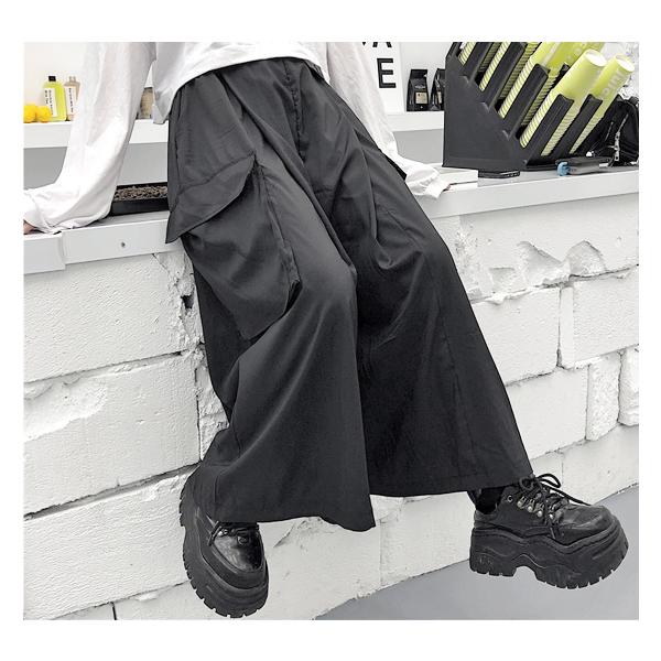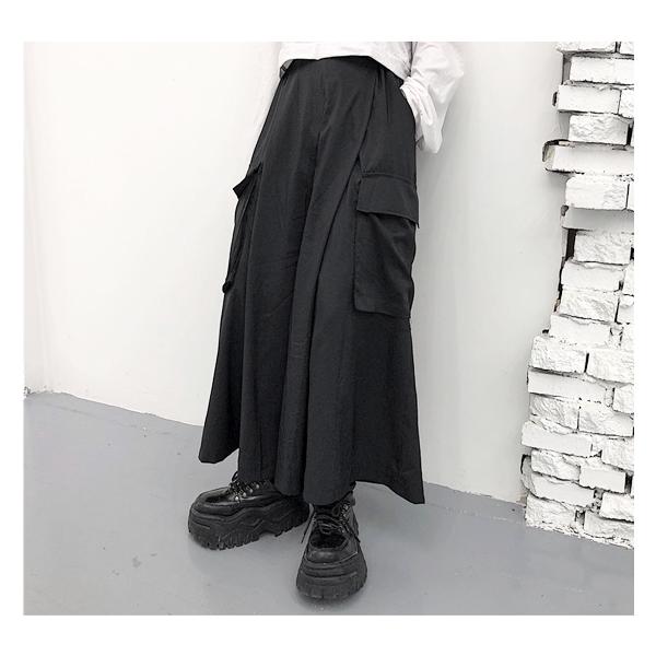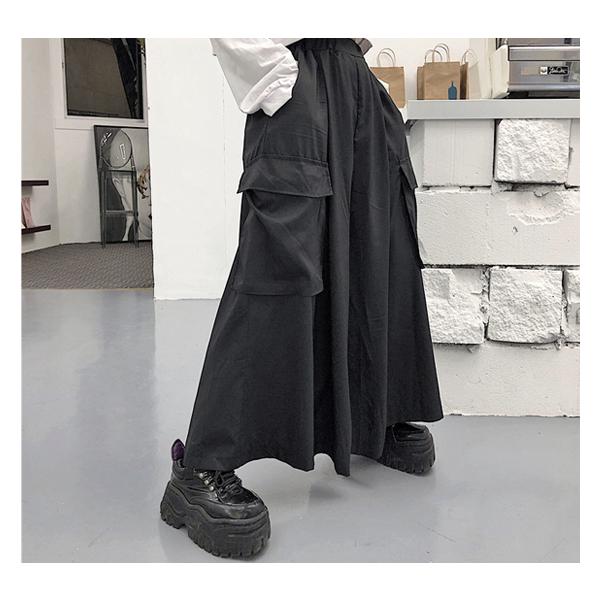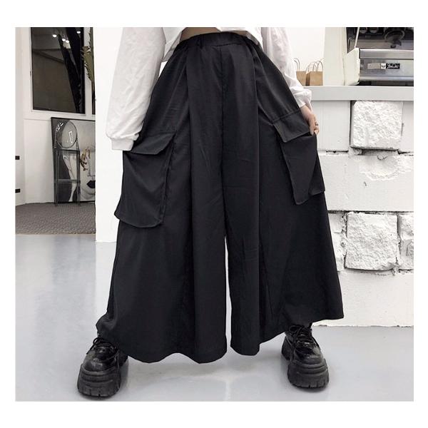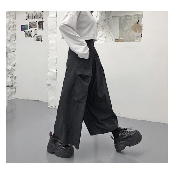 ワイドパンツ モード系 レディース カーゴ風 無地 黒 個性的 韓国