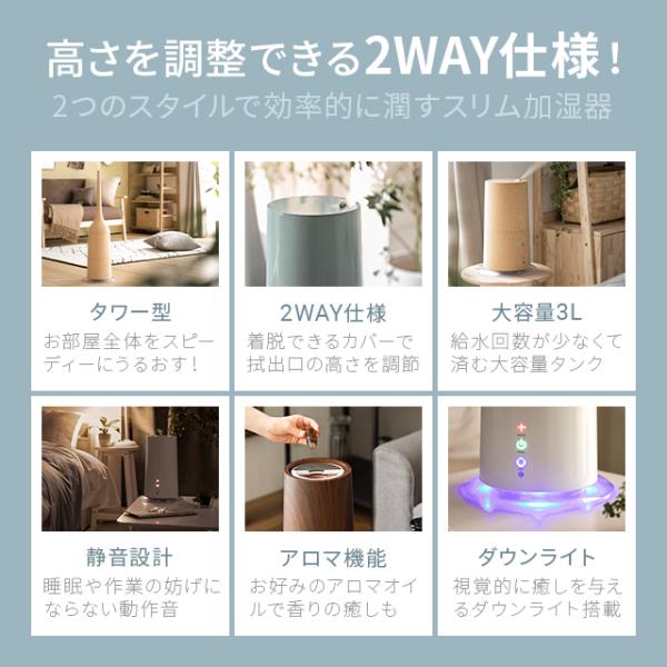 加湿器 省エネ 2WAY タワー型 スリム おしゃれ ハイブリッド加湿器 アロマ 卓上 オフィス 大容量 静音 3L 1年保証