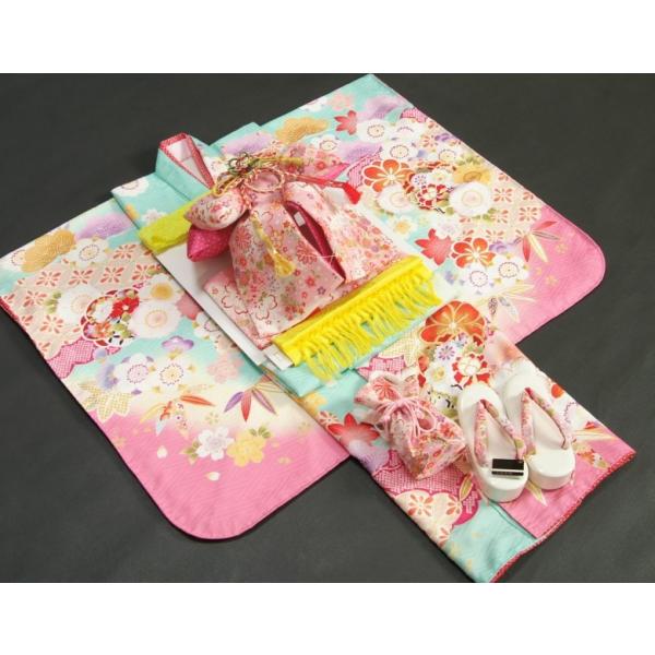 七五三 着物 7歳 着物フルセット 式部浪漫ブランド 淡エメラルドグリーン色地着物 ピンク縮緬地友禅柄帯セット 桜七宝 足袋に腰紐など20点フルセット