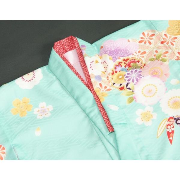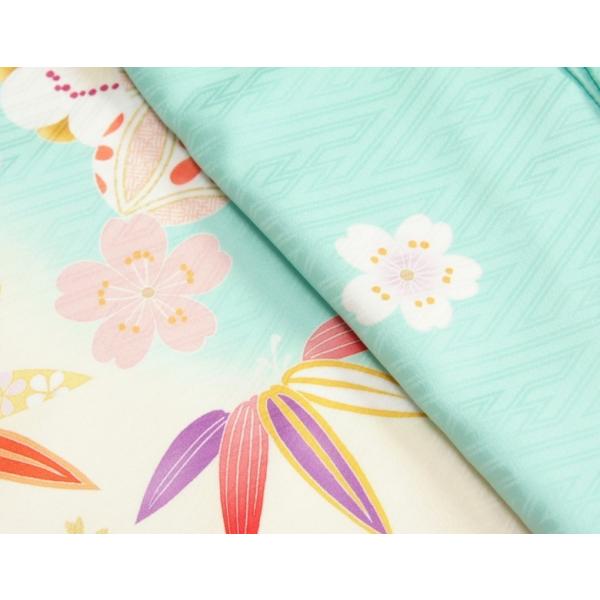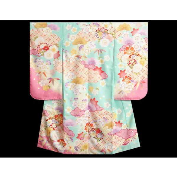 カラーは淡いエメラルドグリーン地の御着物にピンク色で染め分けした可愛らしい柄配色です。
