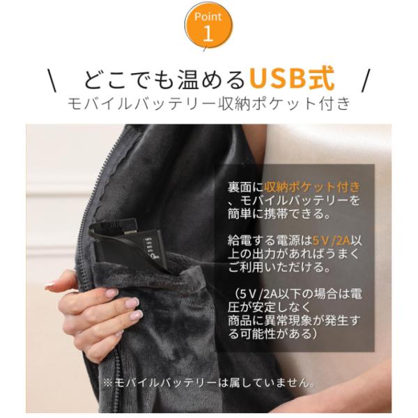 【USBブランケット】電気毛布サイズ:150*85cm約 電源:5V/2A(USBポートより)充電器、モバイルバッテリー、車などから電源を入力できます。ファスナー付き、肩掛けやひざ掛けや巻きスカートなどとして使えて、冷え解消して体をぽかぽか温めてくれます。