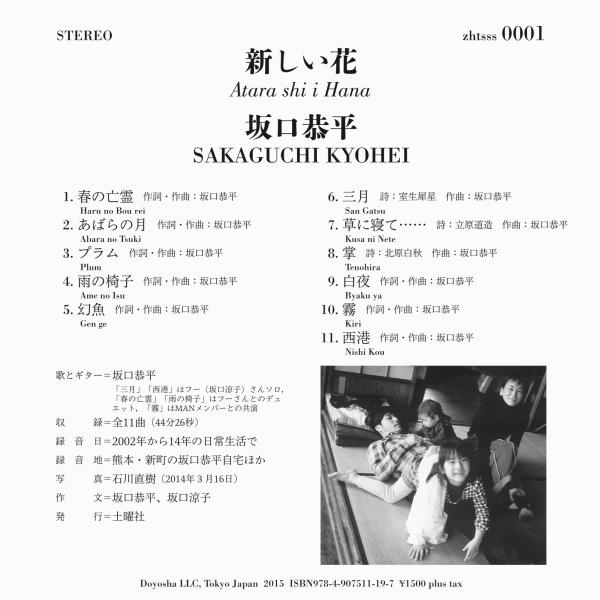 新政府総理大臣・坂口恭平の3年ぶりの新譜は、熊本・新町の作家自宅に寝そべっているかのような、くつろいだ臨場感。NHKもがオンエアした世紀の名曲、大杉栄「魔子よ魔子よ」に続く近代詩シリーズ、室生犀星「三月」、北原白秋「掌」、立原道造「草に寝て……」も胸をうつ。炊事の手をとめて妻のフーさんが歌う美しすぎる「西港」へゆったりと向かう、45分間の日常生活の音楽。冒険家・石川直樹が熊本の一家の日常をとらえたジャケットも必見です。作家本人の解題「新しい花という小さな宴」と制作ノート、妻フーさんの初作文「台所から愛を込めて」も収録。