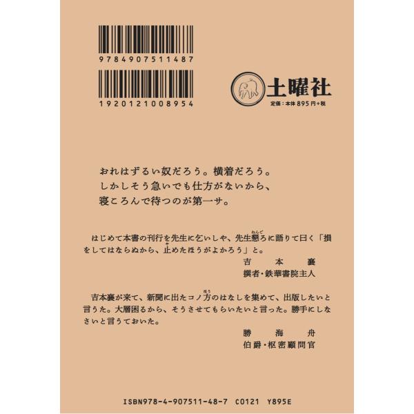 明治維新から三十余年の長命を保った海舟翁が遺した訓話集。日本海軍の草創から江戸開城までの閲歴、早雲・信玄から西郷・坂本にいたる人物論、気を養い色慾を抑える養生法など、一国の安危を一身に担った歴史の当事者が後進のわれわれに処世の秘訣を物語る。