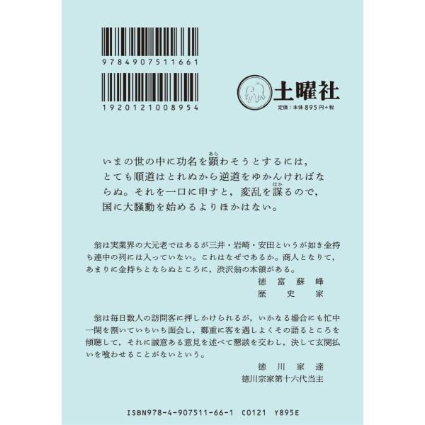 91歳の生涯で1000に余る企業・学校を育成・支援した大実業家の自伝。武州深谷の百姓に生まれた少年が攘夷倒幕を志すも、あろうことか徳川家の直臣として異郷の地パリで維新を迎える羽目となり、のち明治政府を出て実業界に転じる33歳までの履歴を、円熟期を迎えた渋沢翁が、子弟に請われるまま座談のかたちで物語る。