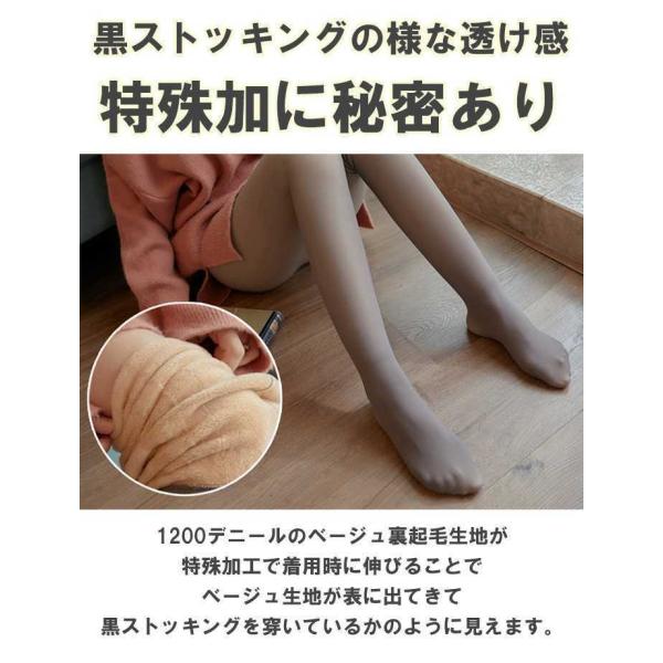 1200デニール裏起毛のベージュの生地を特殊加工し着用時に伸びることでベージュの生地が見えまるで黒ストッキングを穿いているように見えます。