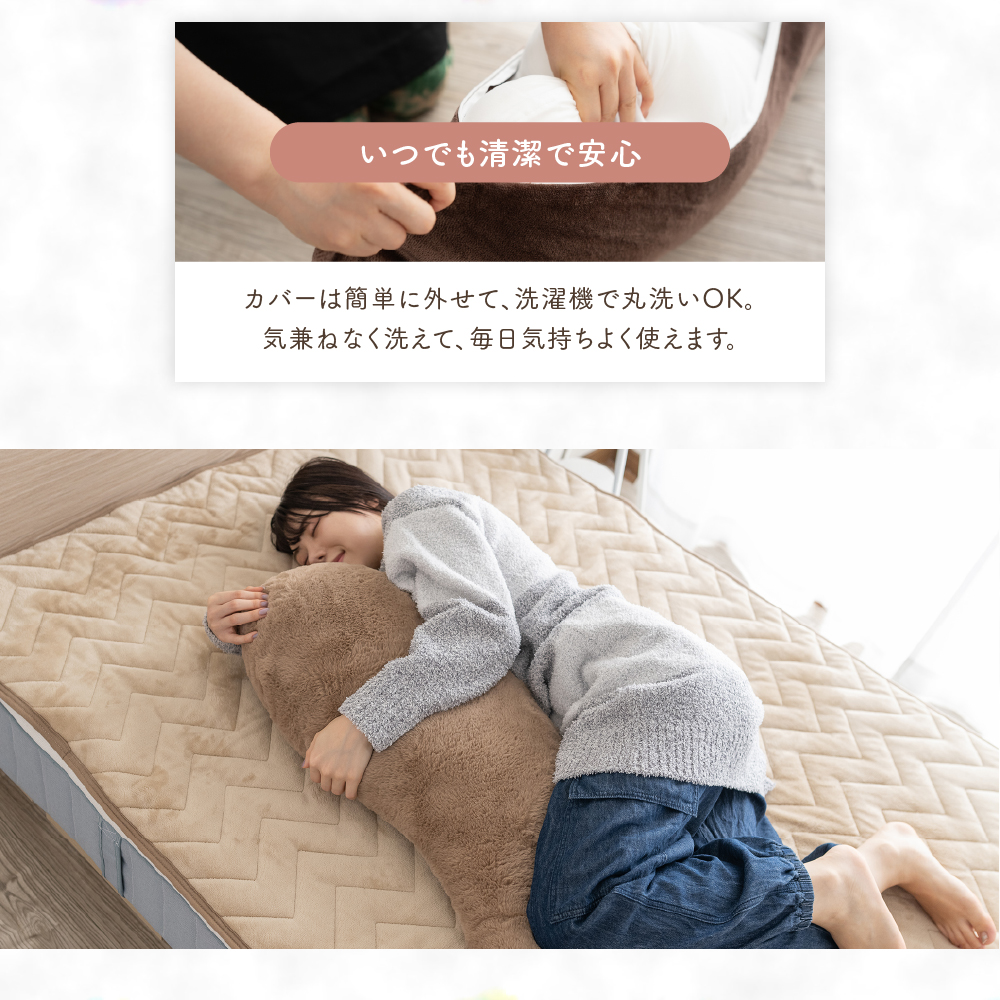 カバー部分は洗濯機で丸洗いOKです。本体が汚れた場合は、手洗いでご対応ください。