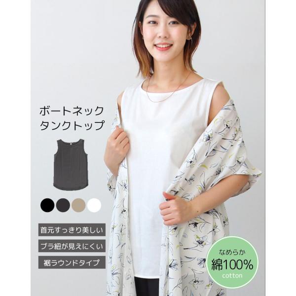 なめらか綿100% ボートネックタンクトップ ノースリーブ カーディガンインナーに最適 きちんと見え 大人カジュアルレディースファッション体型カバー