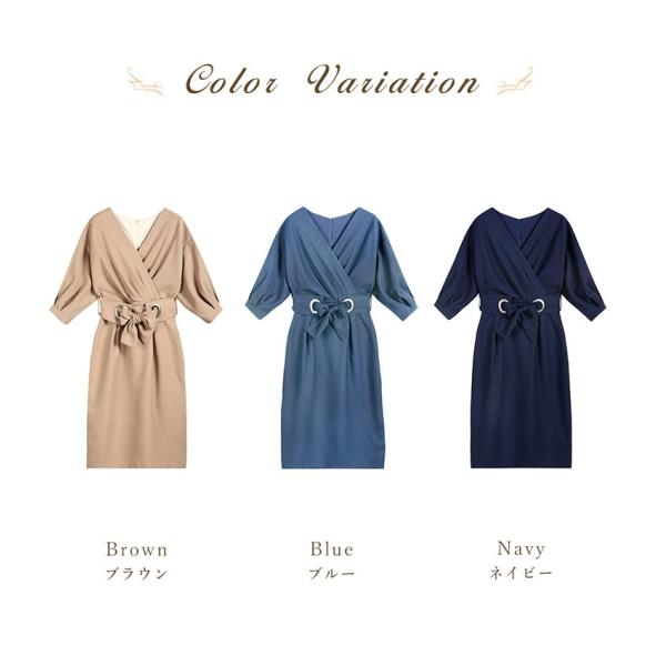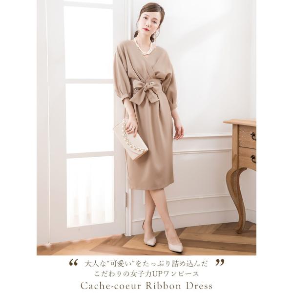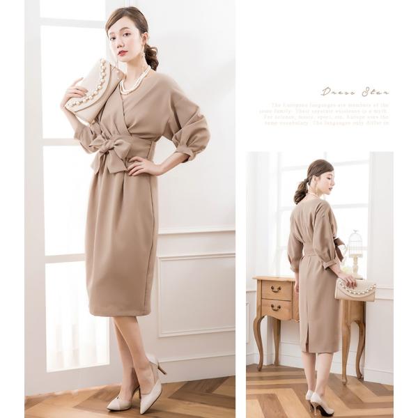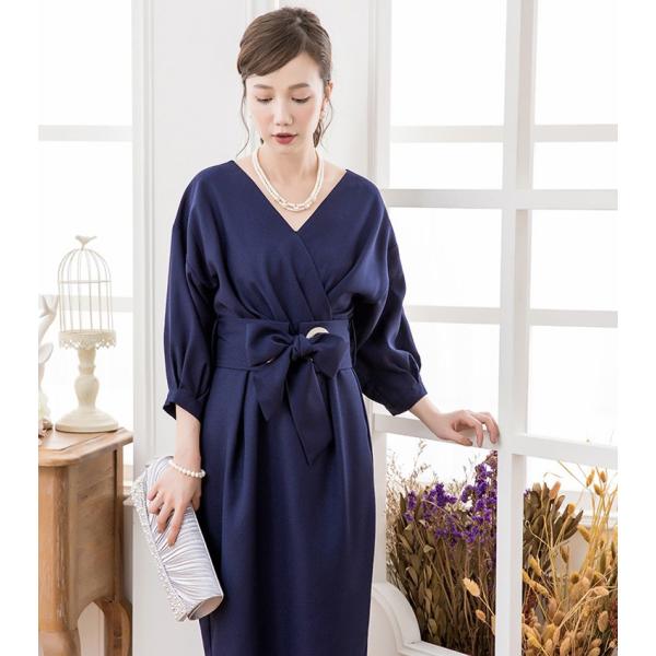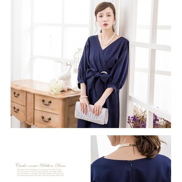 パーティードレス 大きいサイズ 結婚式 袖あり リボン カシュクール バルーンスリーブ ワンピース 膝丈 七分袖 袖あり フォーマル 体型カバー 卒業式 卒園式