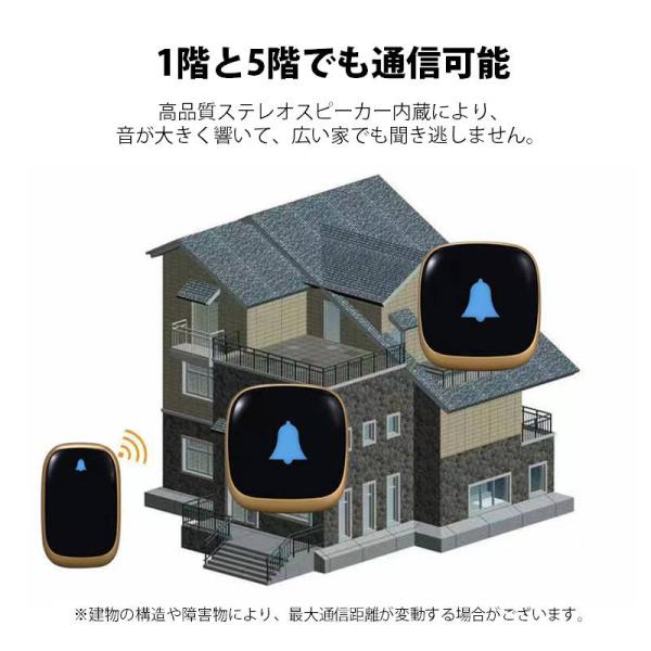 目や耳が不自由な方にも使いやすい、光・音通知のワイヤレスチャイムです。高感度受信機を採用し、最大60mの広範囲通信に対応。住宅や介護施設など、広い空間でも確実に呼び出しできます。呼び出しベルは38曲から選択可能で、音量は4段階調整ができます。