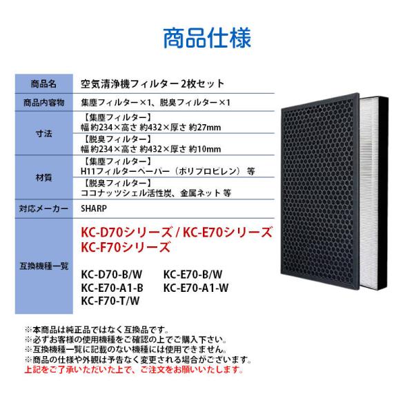 空気清浄機 交換 フィルター SHARP KC-D70 KC-E70 KC-F70 シリーズ 対応 集塵 脱臭 シャープ 互換 ホコリ タバコ 消臭 花粉 対策 掃除 抗菌 プラズマクラスター