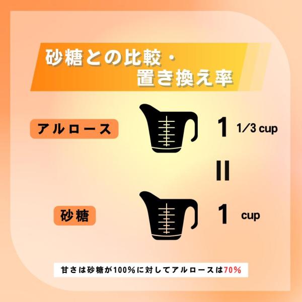 ・アルロースの使い方:普段お使いの砂糖の量より1.4倍程度の量をご使用いただくと砂糖と同じ程度の甘味になります。