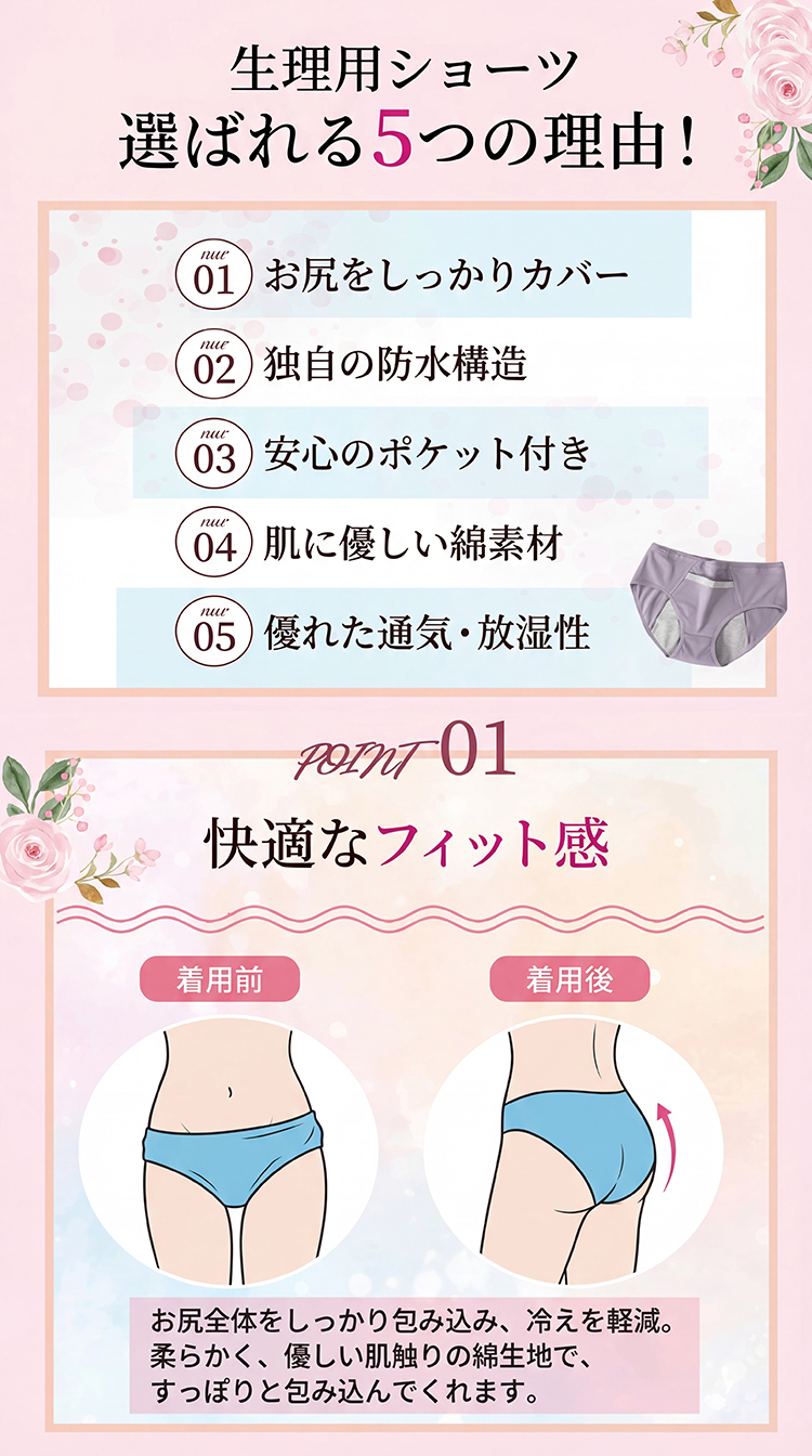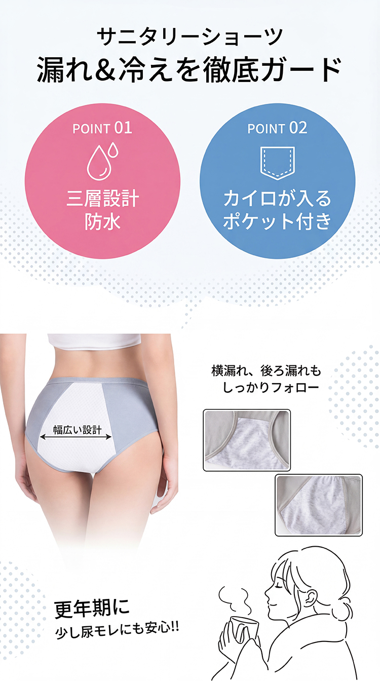 - 三層防水構造で漏れをしっかり防ぎ、素肌に優しい綿素材が生理中も一日中快適にサポートします。