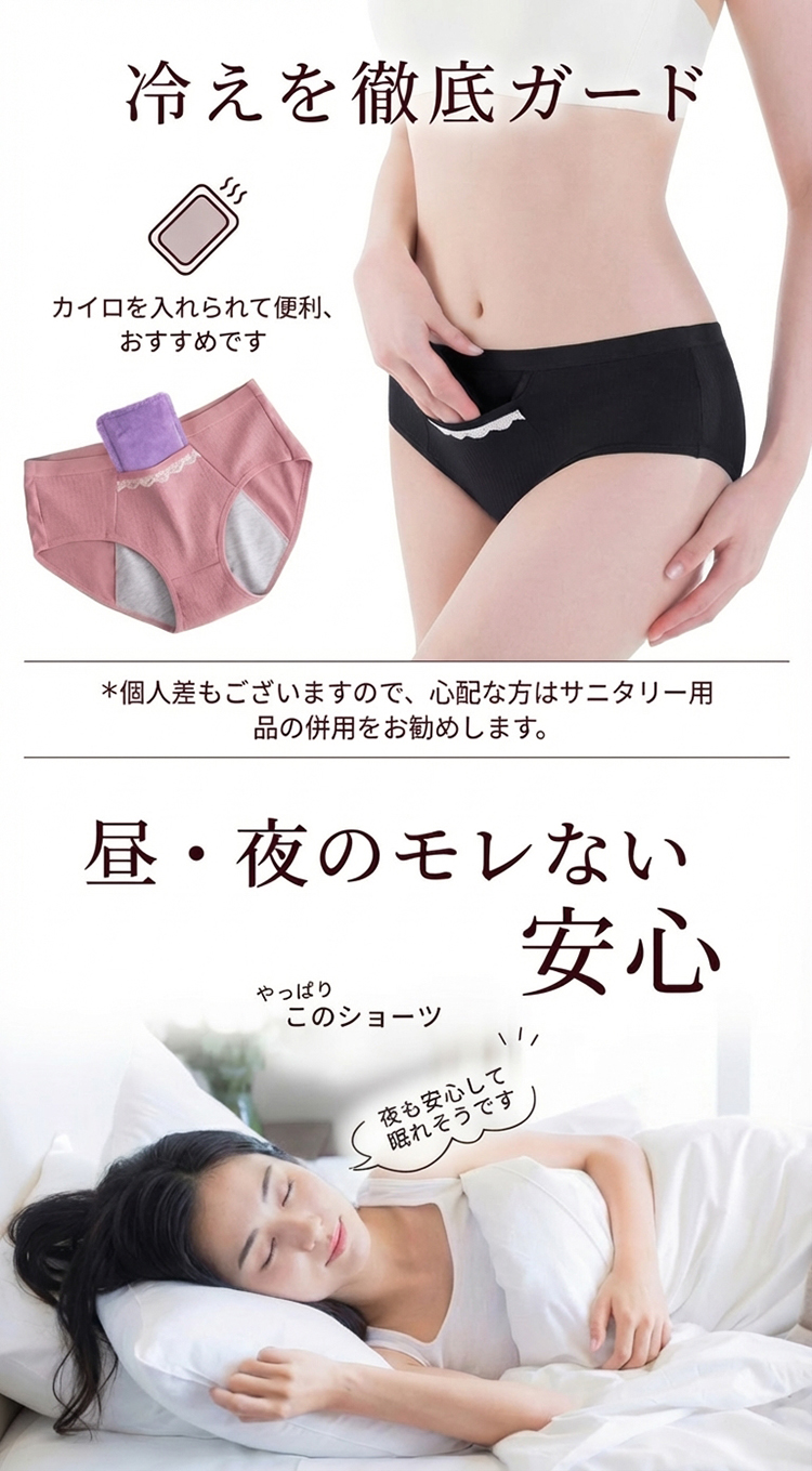 - 冷えやすいお腹まわりをやさしく守り、カイロポケット付きで生理中の不安と冷え対策を同時に叶えるサニタリーショーツです。