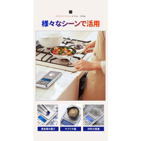 - 様々なシーンで活用 (貴金属の重さ、サプリや薬、調理など)