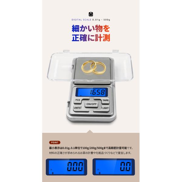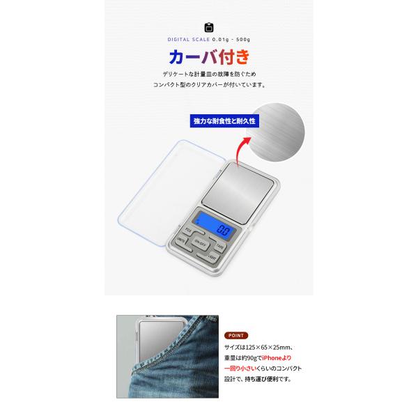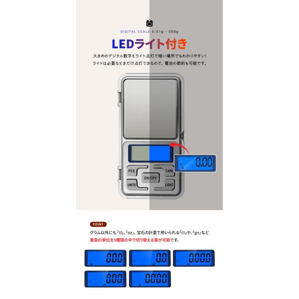 デジタルスケール 計り はかり スケール キッチンスケール 0.01〜500g ポケットデジタルはかり LEDライト 電池式 精密秤 コンパクト