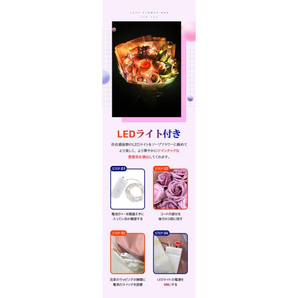 - 存在感抜群のLEDライトをソープフラワーに絡めてより美しく、より華やかにロマンチックな雰囲気を演出してくれます。