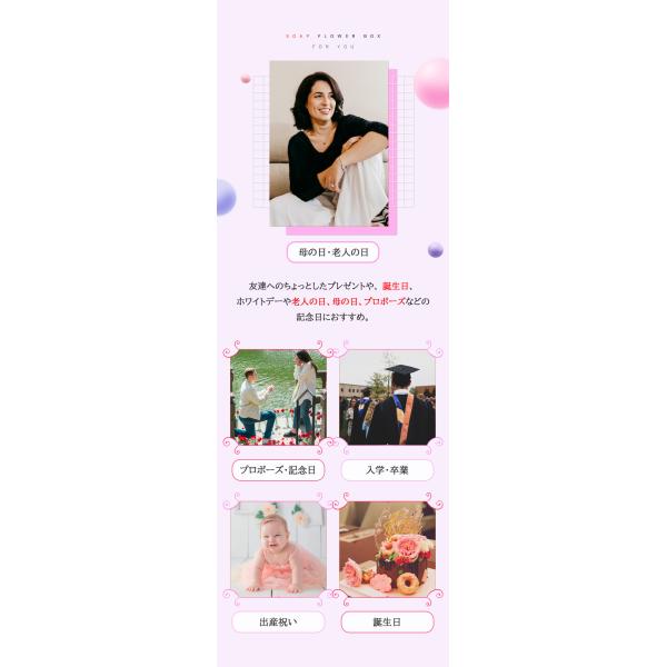 - 友達へのちょっとしたプレゼントや、誕生日、ホワイトデーや老人の日、母の日、プロポーズなど記念日におすすめ。