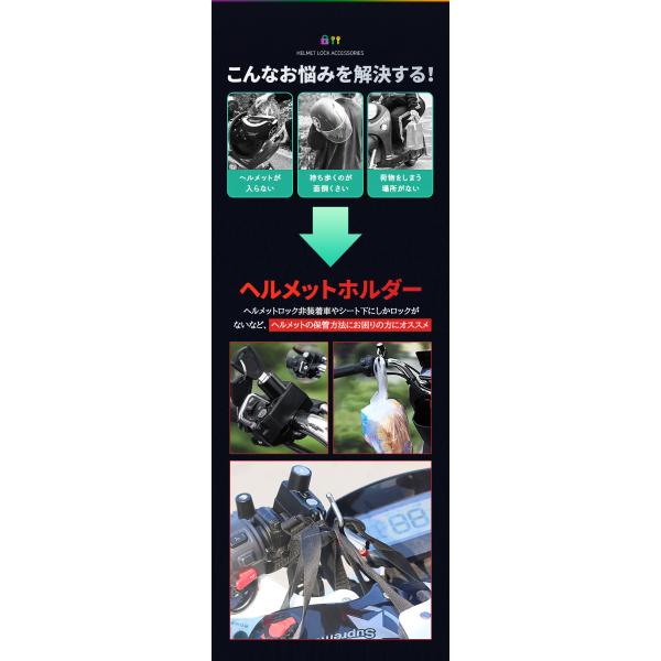 - ヘルメットロック非装着車やシート下にしかロックがないなど、ヘルメットの保管方法にお困りの方にオススメ